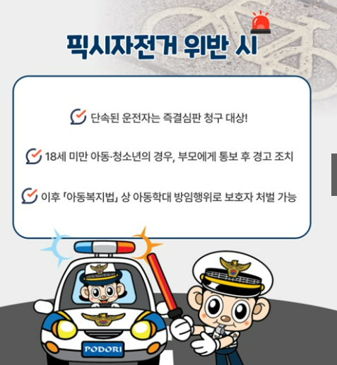 브레이크 없는 픽시를 타다 단속에 걸리면 즉결심판 청구 대상이 되며, 18세 미만의 경우 부모에게 통보되어 경고 조치가 이뤄집니다. 반복될 경우 보호자까지 아동학대 방임으로 처벌받을 수 있어, 단순한 개인의 문제가 아닌 가족 전체의 문제로 번질 수 있습니다. 이러한 단속 강화는 청소년을 겨냥한 규제가 아니라 모두의 안전을 위한 최소한의 안전장치라고 할 수 있습니다.