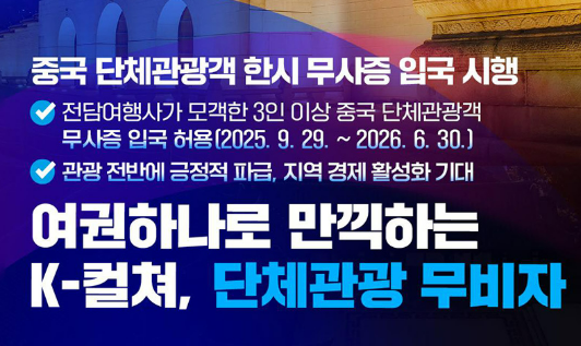 2025년 9월 29일부터 내년 6월 30일까지 약 9개월간 중국인 단체관광객의 무비자 입국이 한시적으로 시행됩니다. 이번 중국인 한국 무비자 입국 제도는 한국 관광산업에 새로운 전환점을 제공할 것으로 전망됩니다. 법무부, 문화체육관광부, 외교부가 합동으로 마련한 이 정책은 3인 이상으로 구성된 중국인 단체관광객이 전담여행사를 통해 입국할 경우, 별도의 비자 없이도 최대 15일간 한국 전역을 자유롭게 여행할 수 있도록 허용하는 내용을 담고 있습니다.