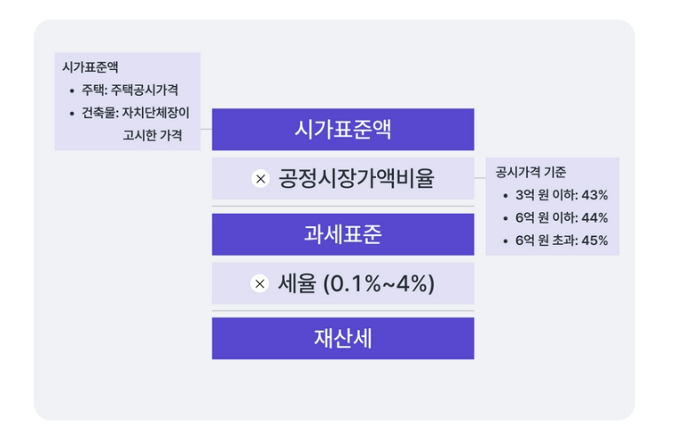 먼저 과세표준을 산정하는데, 이는 시가표준액에 공정시장가액비율을 곱하여 계산됩니다. 주택의 경우 주택공시가격이 기준이 되며, 건축물은 지방자치단체장이 고시한 가격, 토지는 개별공시지가가 적용됩니다. 다음으로 이렇게 산출된 과세표준에 재산세율(0.1%-4%)을 곱하여 최종 재산세가 결정됩니다.