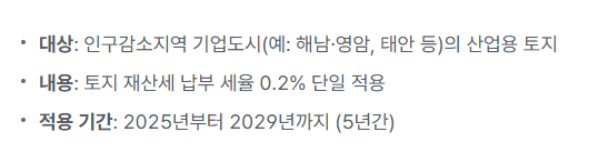 또한 인구감소지역의 산업용 토지에 대해서는 5년간 재산세 세율 0.2%가 단일 적용되는 특례가 신설되었습니다. 해당 지역에 산업용 토지를 소유하고 계신 분들은 상당한 혜택을 받을 수 있을 것으로 예상됩니다.