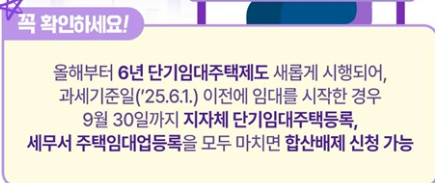 또한 올해부터는 6년 단기임대주택 제도가 신설되어, 과세기준일인 2025년 6월 1일 이전에 임대를 개시하고, 9월 30일까지 지자체 임대사업자 등록과 세무서 임대업 등록을 모두 완료한 경우에만 합산배제 혜택을 받을 수 있습니다. 따라서 임대주택을 보유하고 있는 납세자는 반드시 관련 등록 절차를 마쳐야 세금 부담을 줄일 수 있습니다.