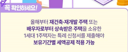 이 외에도 지방 저가주택을 소유하고 있거나, 부부 공동명의로 주택을 보유한 경우에도 특례 신청을 할 수 있습니다. 특히 올해부터는 재건축·재개발 주택을 보유한 경우와 배우자로부터 상속받은 주택을 소유한 경우에도 반드시 특례 신청서를 제출해야 보유기간별 세액공제를 적용받을 수 있습니다. 이는 제도 변경 사항이므로 해당되는 납세자는 반드시 확인하고 기한 내에 신청해야 불이익을 피할 수 있습니다.