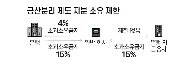 금산분리란 금융자본과 산업자본을 분리해 서로 지배하거나 소유하지 못하도록 하는 제도입니다. 쉽게 말해, 일반 기업이 은행을 소유하거나, 반대로 은행이 일반 기업을 지배하지 못하도록 막는 장치입니다. 우리나라에서는 산업자본이 은행 지분을 4% 이상 보유할 수 없으며, 지방은행의 경우에만 15%까지 예외적으로 허용하고 있습니다. 이러한 규제는 단순히 기업의 자유를 제한하기 위한 것이 아니라, 금융 시스템의 안정성과 공공성을 지키기 위한 기본 원칙입니다.