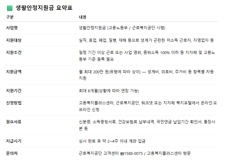 생활안정지원금은 단순한 일회성 지원이 아니라, 위기 상황에서 다시 일어설 수 있도록 돕는 복지제도입니다. 국민연금 납입기간이 꾸준한 근로자, 소득이 일시적으로 감소한 가구, 생계 유지가 어려운 취약계층 등은 각 제도의 요건을 잘 확인해 신청한다면 실질적인 도움을 받을 수 있습니다.