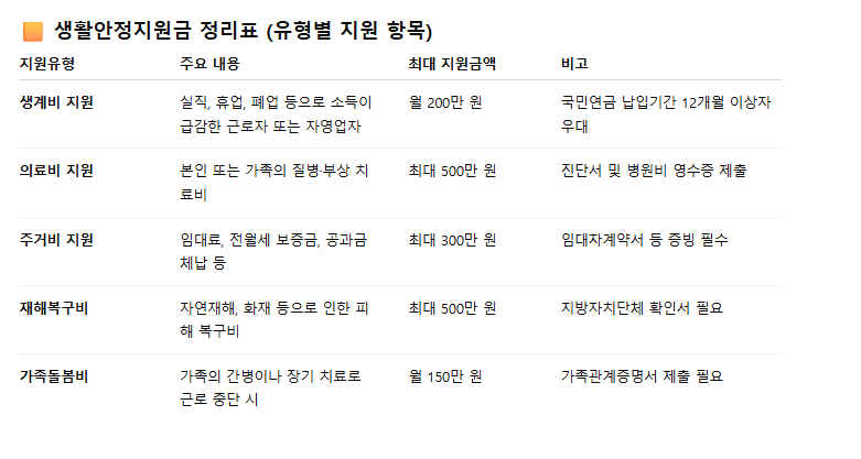 생활안정지원금의 주요 유형과 대상별 지원내용