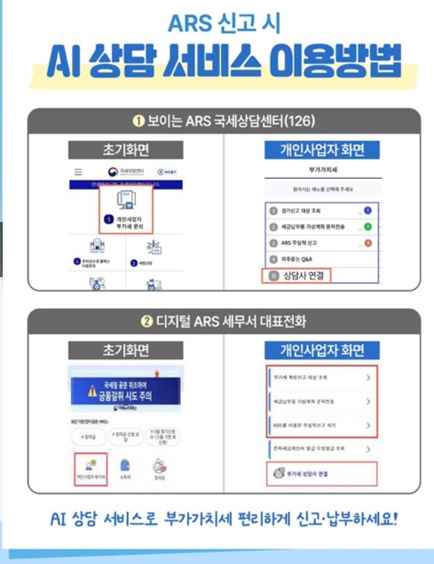 - 세무서 대표번호 이용방법: 대표번호 → 6번(부가세 상담) → AI 상담사 연결
