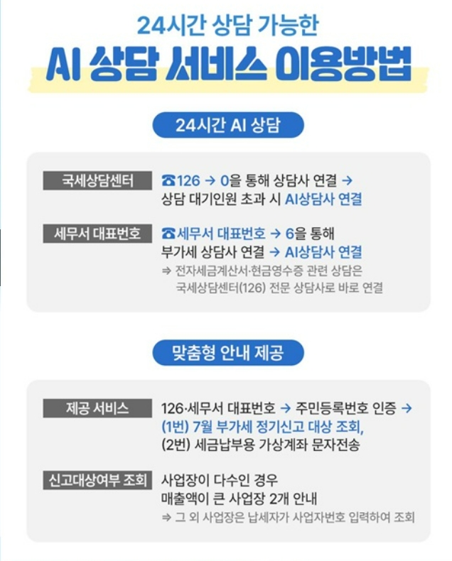 - 국세상담센터 이용방법: ☎126 → 0번(상담사 연결) → 상담 대기 인원 초과 시 AI 상담사 자동 연결