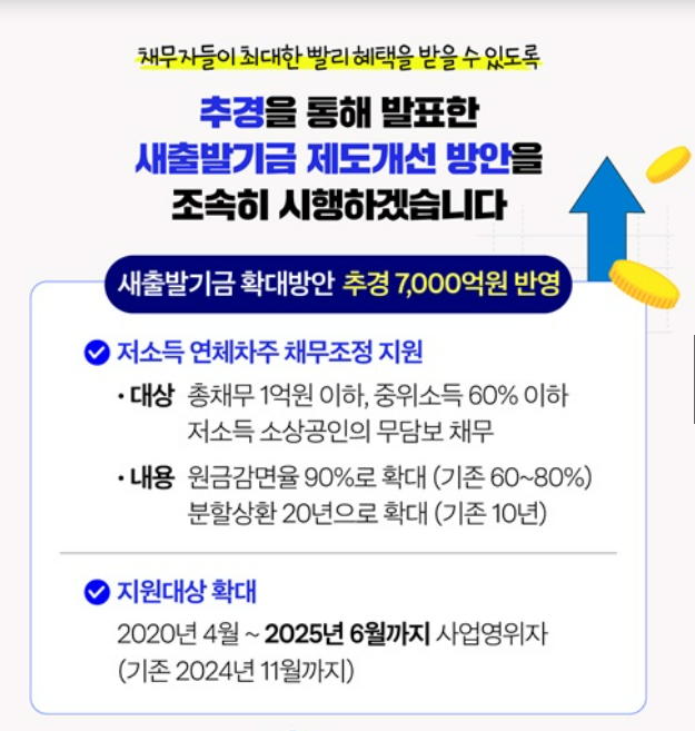 채무 부담으로 어려움을 겪는 국민을 위해 운영 중인 '새출발기금' 제도 지원대상을 2025년부터 확대한다고 밝혔습니다. 이번 확대 조치로 소상공인, 폐업자, 취약채무자 등 금융회복이 절실한 계층에게 실질적인 도움이 제공된 전망입니다.