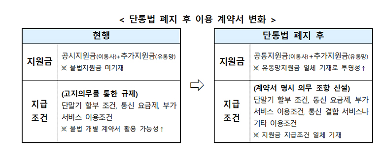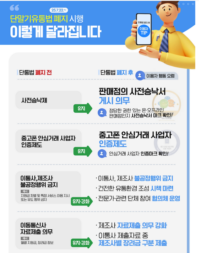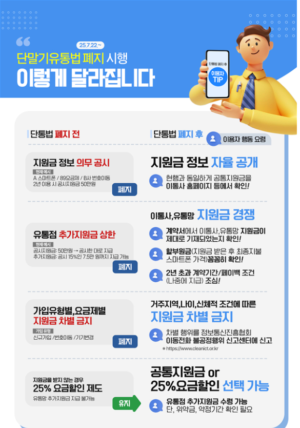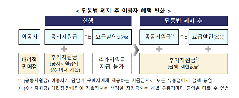 오는 7월 22일부터 이동통신단말장치 유통구조 개선에 관한 법률(단통법)이 폐지되고, 개정된 전기통신사업법이 새롭게 시행된다. 단통법이 2014년 제정된 이후 10년 만의 전면적인 제도 개편이다.