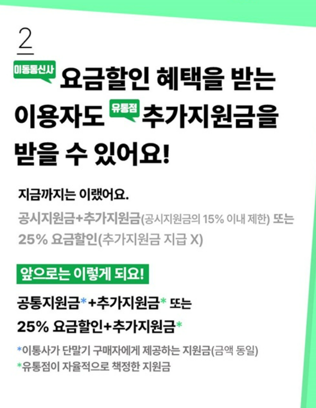 개정된 제도 아래에서는 요금할인(25%)을 선택한 소비자도 유통점의 추가지원금을 받을 수 있습니다. 이통사가 제공하는 공통지원금 외에도, 유통점이 자율적으로 제공하는 혜택이 모두 적용될 수 있는 구조가 마련되었습니다.