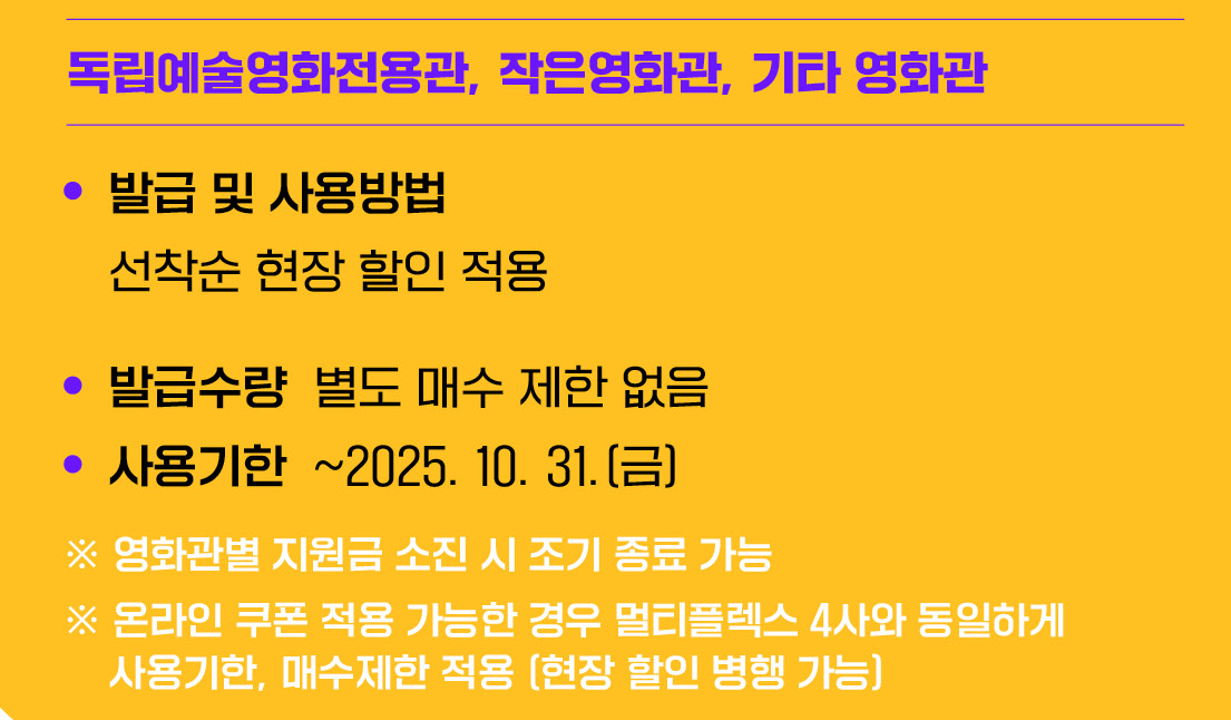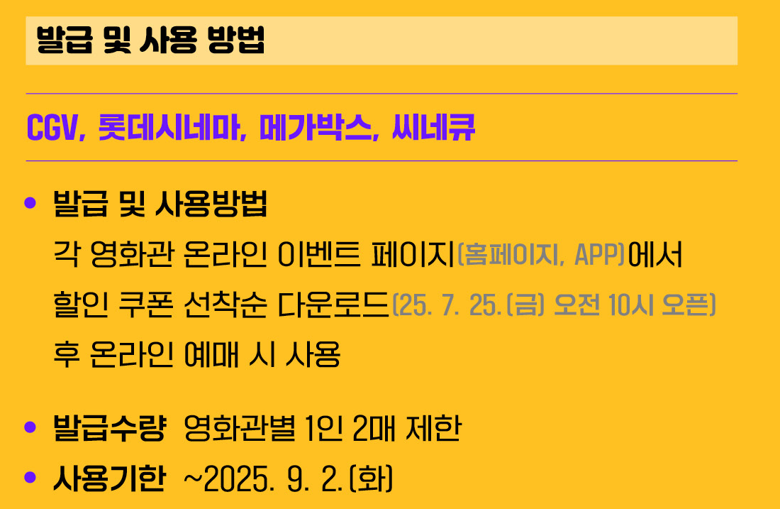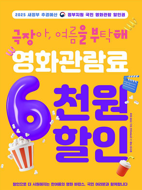할인권은 오는 7월 25일 오전 10시부터 전국 동시 발급되며, CGV, 롯데시네마, 메가박스, 씨네Q 등 주요 멀티플렉스 체인은 물론, 광주극장, 독립영화관, 예술영화전용관, 실버영화관, 작은영화관 등 다양한 형태의 상영관에서 사용할 수 있습니다. 누리집 또는 앱에서 예매 시 할인권을 적용할 수 있으며, 일부 독립·예술영화관은 시스템 사정상 현장 발급으로 선착순 할인 제공을 합니다.