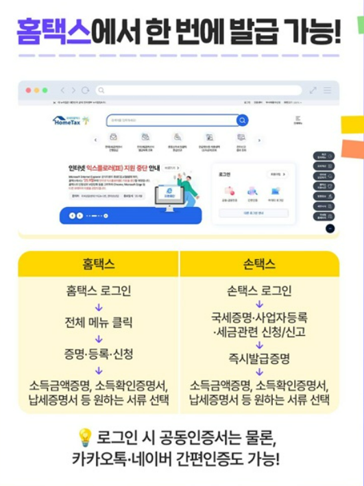 사실 이 모든 서류는 온라인 홈택스와 손택스에서 즉시 발급받을 수 있습니다. 더 이상 점심시간을 쪼개서 창구에 가거나, 날씨가 궂은 날 외출할 필요가 없습니다. 집, 사무실, 심지어 버스 안에서도 스마트폰만 있으면 발급이 가능합니다.