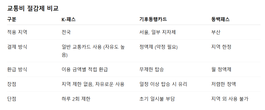 결과적으로 K-패스는 단순 할인 카드가 아니라, 대중교통을 일상적으로 이용하는 모든 국민에게 매월 수만 원의 생활비 절약을 가능하게 하는 실질적 혜택을 제공합니다.