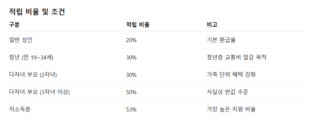 K-패스의 가장 큰 매력은 단연 높은 환급 비율입니다. 일반인도 20%를 환급받을 수 있으며, 청년은 30%, 다자녀 가정은 최대 50%, 저소득층은 53%까지 지원을 받을 수 있습니다. 이는 단순 할인 수준을 넘어 사실상 교통비 절반 이상을 절약할 수 있는 제도입니다.