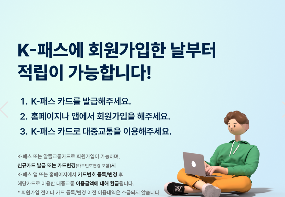K-패스를 이용하려면 먼저 K-패스 전용 카드 발급과 등록 절차를 거쳐야 합니다. 단순히 교통카드만 발급받아 사용하는 것이 아니라, 반드시 K-패스 홈페이지 또는 앱에서 카드 등록을 해야만 적립이 인정된다는 점을 잊지 말아야 합니다.