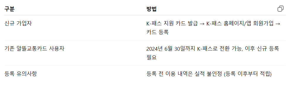 - 기존 알뜰교통카드 이용자는 2024년 6월 30일까지 K-패스로 전환을 완료해야 혜택을 이어받을 수 있었습니다. 만약 전환을 놓쳤다면 신규 가입 절차를 다시 밟아야 합니다. 이 과정에서 홈페이지를 통한 사전 동의 절차가 있었고, 지금은 K-패스 신규 발급 절차와 동일하게 진행됩니다.