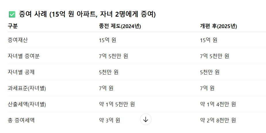 하지만 세율 구간 조정에 따라 증여세 부담도 일부 줄어들게 됩니다. 예를 들어, 15억 원 상당의 아파트를 두 자녀에게 증여한다고 가정해 보겠습니다. 기존 제도에서는 각 자녀가 7억 원의 과세표준을 적용받아 산출세액이 약 1억 5천만 원 수준이었는데, 내년부터는 같은 조건에서 1억 4천만 원으로 줄어듭니다. 즉, 두 자녀 합산 기준으로 3억 원에서 2억 8천만 원으로 2천만 원 정도 세부담이 줄어드는 것입니다.