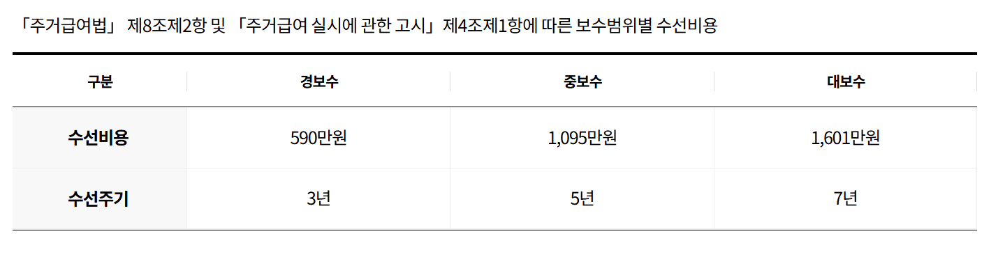 수선유지급여는 주택 상태에 따라 경보수, 중보수, 대보수로 나뉘며, 각각 지원 금액과 주기가 다릅니다. 2025년 기준으로 경보수는 590만원(3년 주기), 중보수는 1,095만원(5년 주기), 대보수는 1,601만원(7년 주기)까지 지원됩니다. 주택의 구조 안정성, 설비 상태, 마감재 상태 등을 종합적으로 평가해 지원 수준을 결정하는 만큼, 주거환경 개선에 실질적으로 도움이 됩니다.