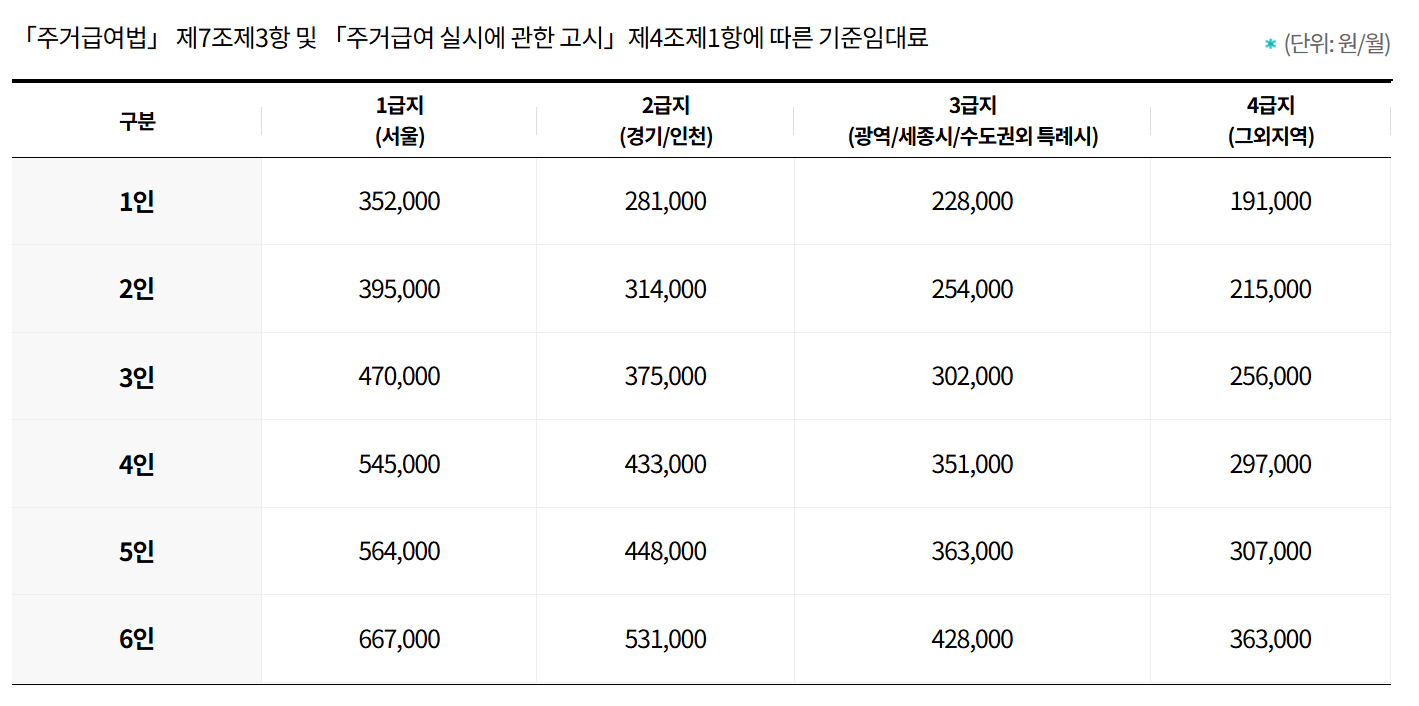 2025년 기준임대료를 살펴보면, 서울에 거주하는 1인 가구는 최대 352,000원, 4인 가구는 최대 545,000원까지 지원받을 수 있습니다. 인천·경기 지역은 1인 가구 281,000원, 4인 가구 433,000원 수준이며, 지방의 경우에도 거주 지역에 따라 차등 지원이 이뤄집니다. 이처럼 지역별, 가구원별로 세밀하게 기준이 마련되어 있어 실제 부담하는 임대료를 현실적으로 보전할 수 있습니다.