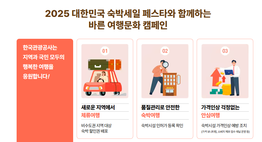 숙박세일페스타는 문화체육관광부와 한국관광공사가 주관하는 전국 단위 숙박비 할인 행사로, 국민의 여행 부담을 줄이고 침체된 지역 관광산업을 활성화하는 목적을 가지고 있습니다. 특히 최근 경기 침체와 소비 위축으로 어려움을 겪는 소상공인과 지역 업계에는 큰 도움이 되는 프로젝트입니다.