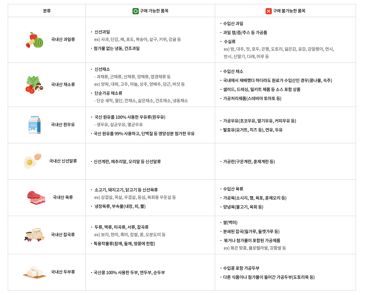 바우처 형태로 지급. 건강한 먹거리 위주로 구매 가능.